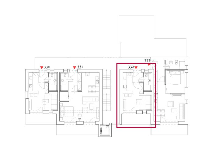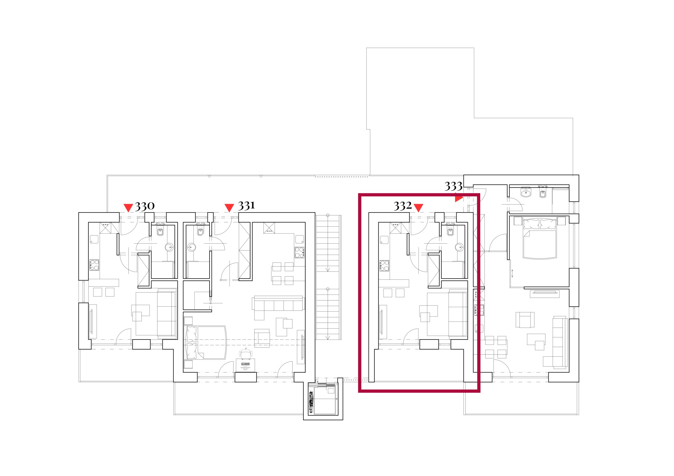 Junior Suite Apartmá disponuje zádveřím s úložným prostorem, kuchyňským koutem, elegantní koupelnou, útulným obytným pokojem a prostornou lodžii propojující interiér s okolní přírodou. Každý detail odráží švýcarskou kvalitu a nadčasový design.