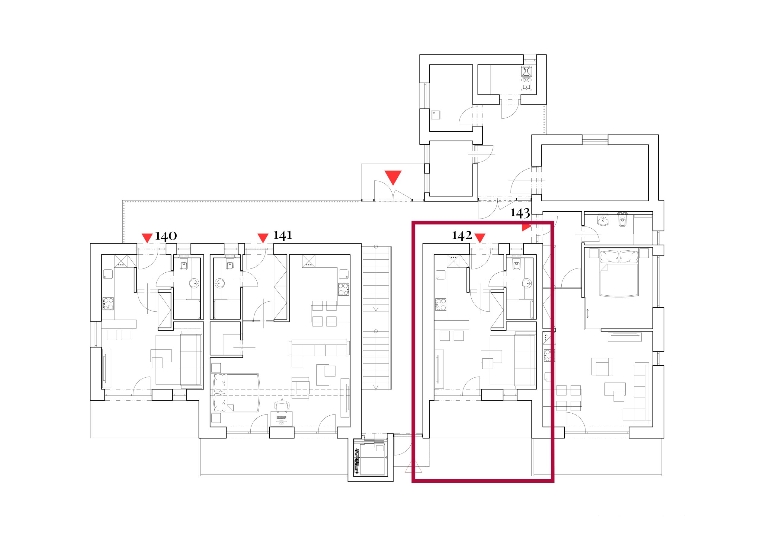 Junior Suite Apartmá disponuje zádveřím s úložným prostorem, kuchyňským koutem, elegantní koupelnou, útulným obytným pokojem a prostornou terasou propojující interiér s okolní přírodou. Každý detail odráží švýcarskou kvalitu a nadčasový design.