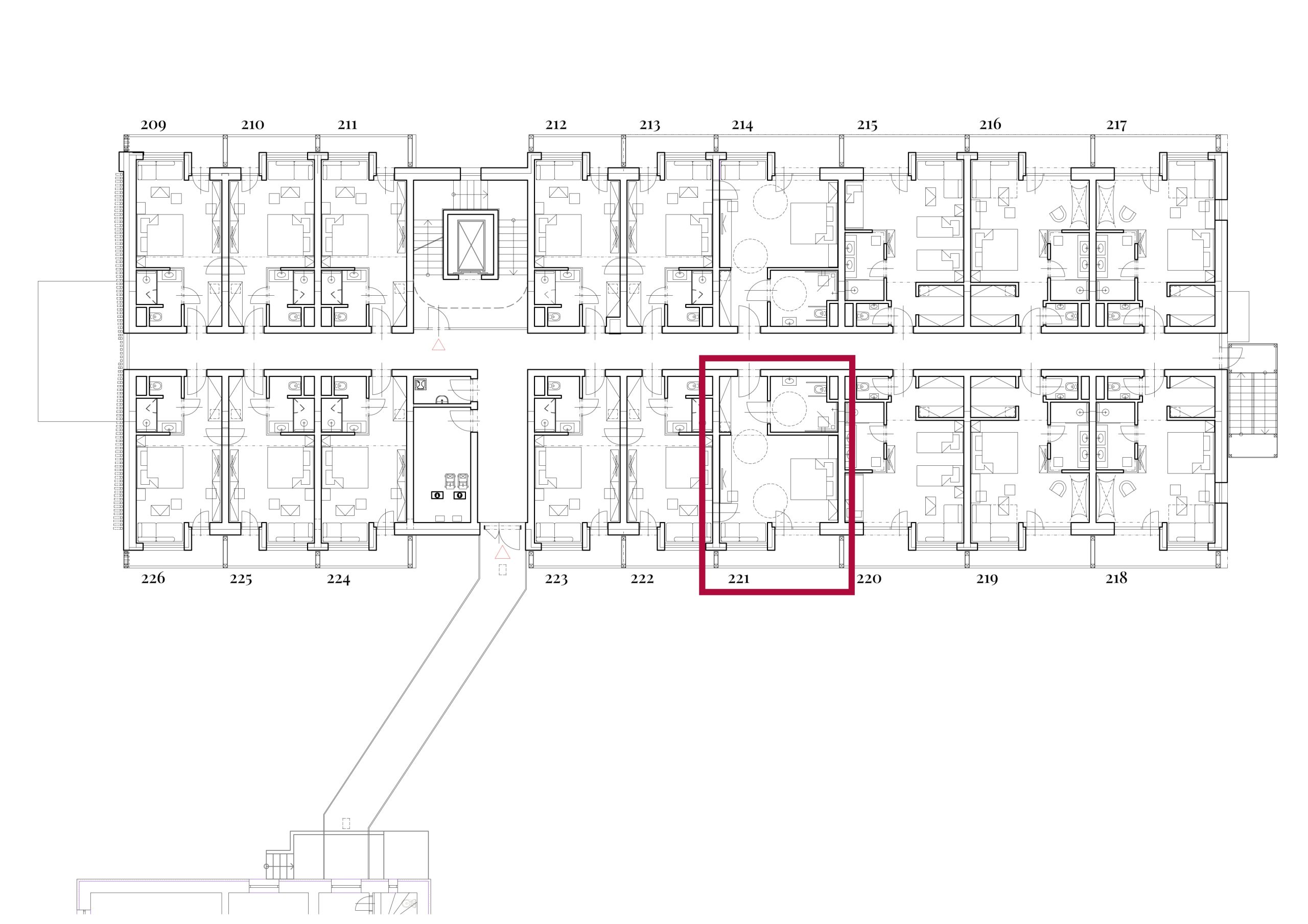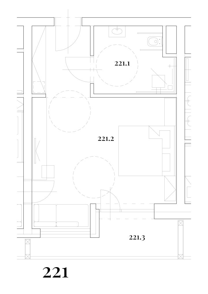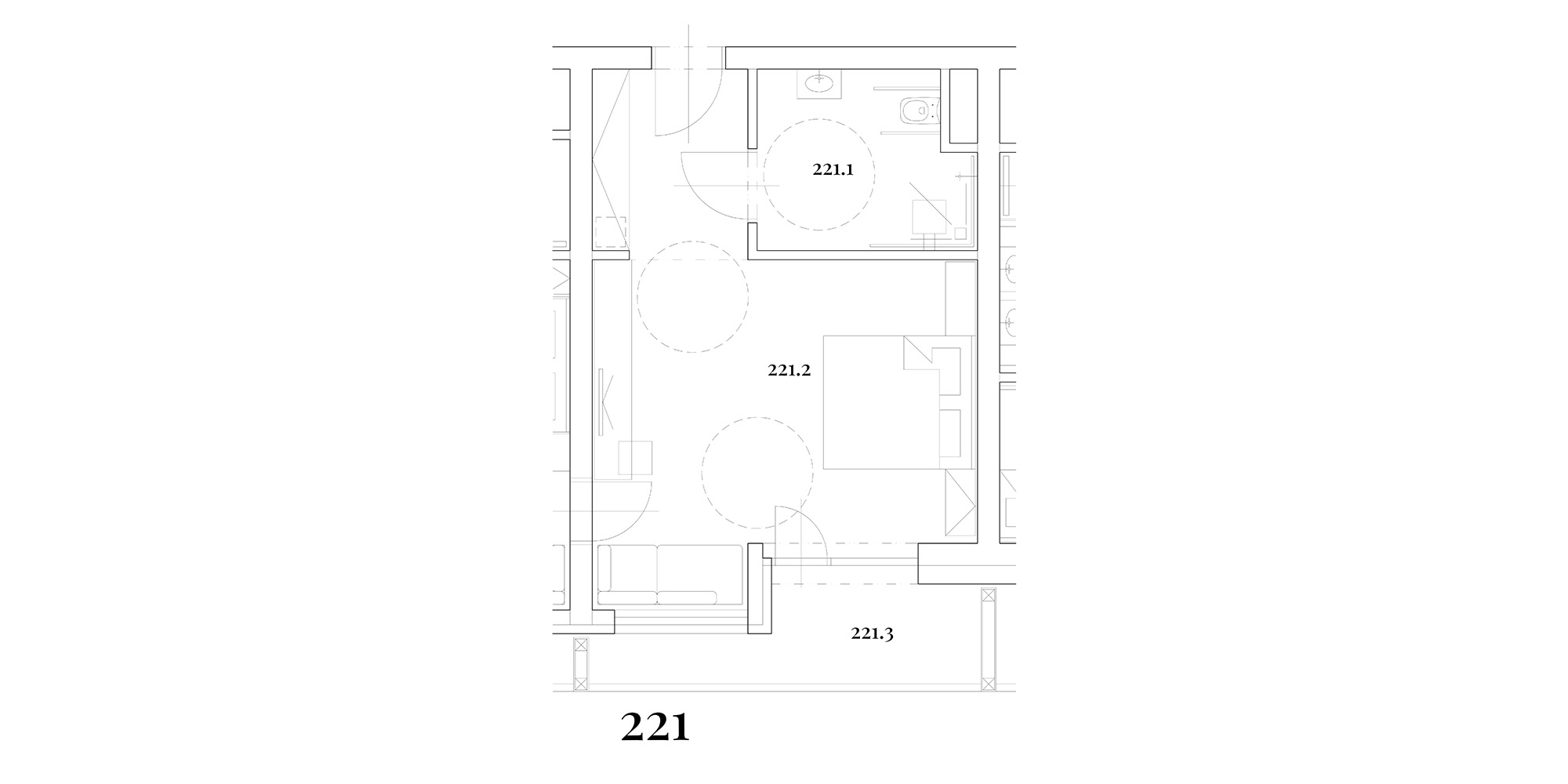 Standard apartmá nabízí zádveří s úložným prostorem, elegantní koupelnu, útulný obytný pokoj a příjemnou lodžii propojující interiér s okolní přírodou. Každý detail odráží švýcarskou kvalitu a nadčasový design. Celková plocha apartmá je 41,17 m².