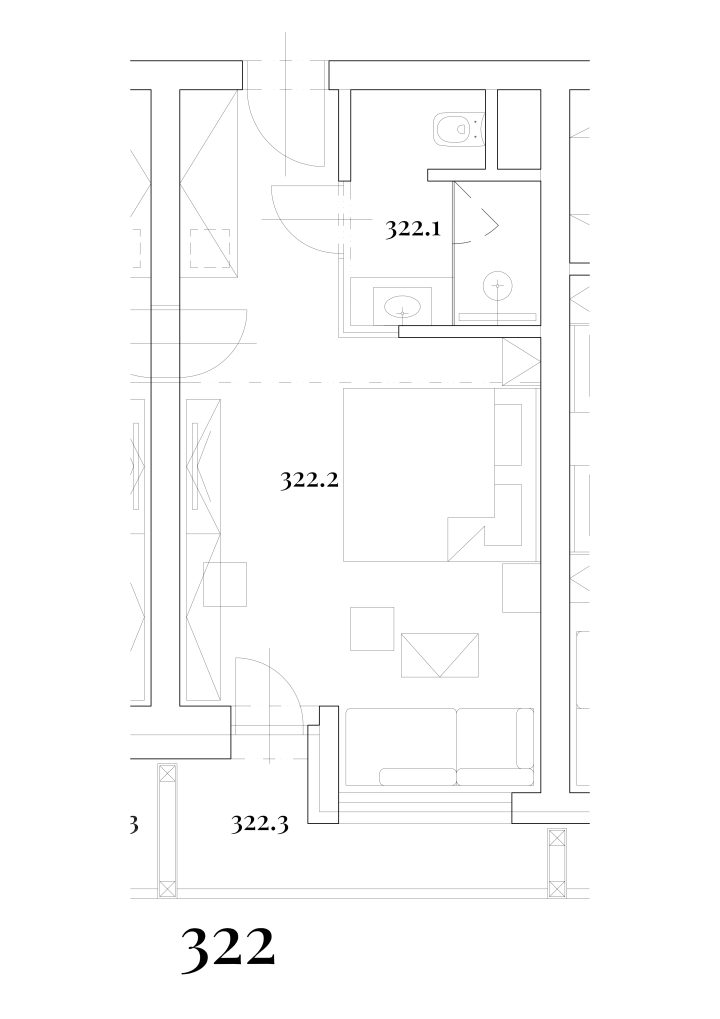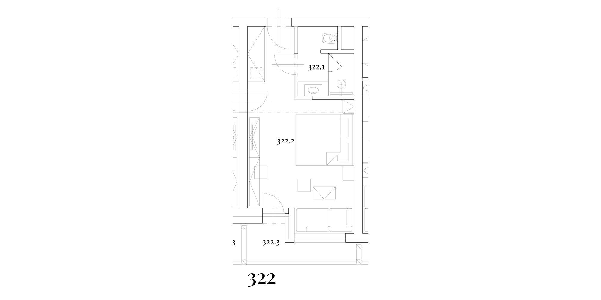 Standard apartmá nabízí zádveří s úložným prostorem, elegantní koupelnu, útulný obytný pokoj a příjemnou lodžii propojující interiér s okolní přírodou. Každý detail odráží švýcarskou kvalitu a nadčasový design. Celková plocha apartmá je 29,57 m².