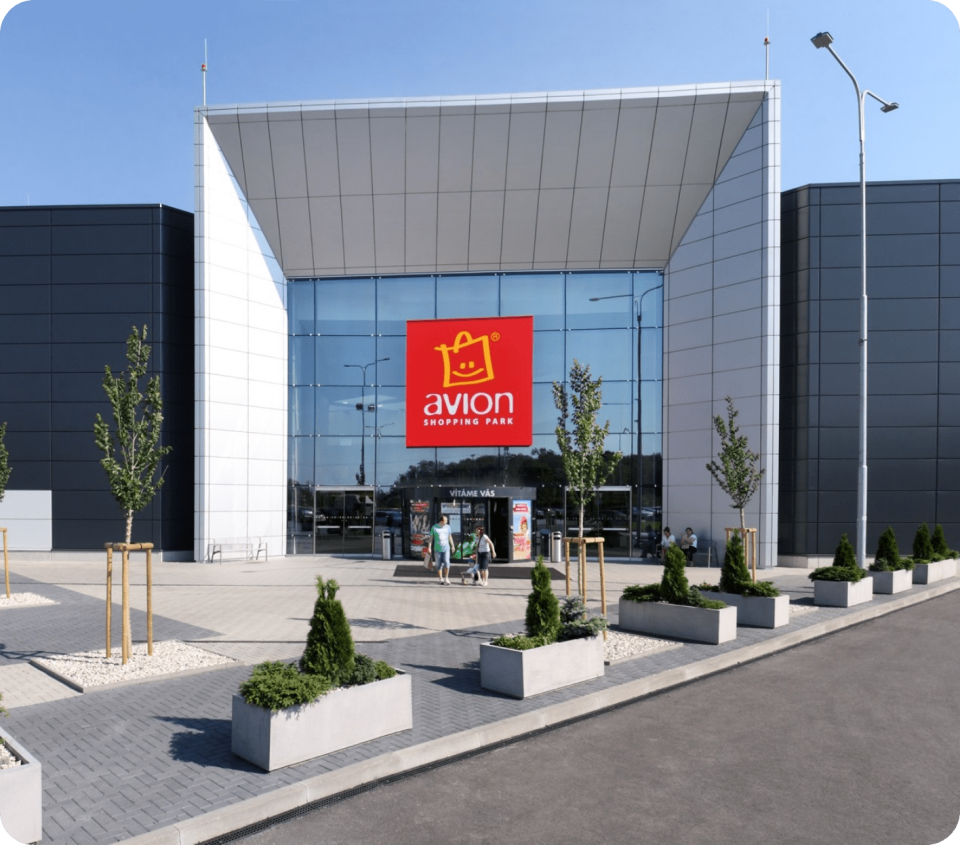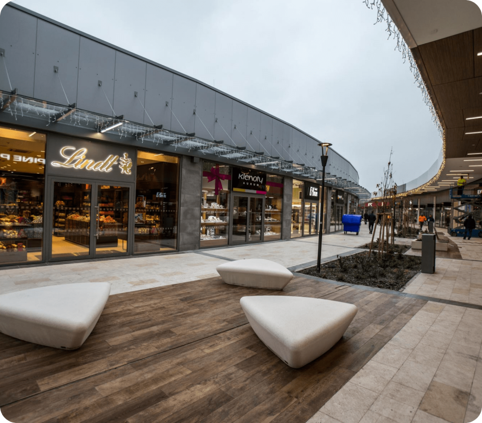Rozsáhlý nákupní areál s širokou nabídkou obchodů a služeb.