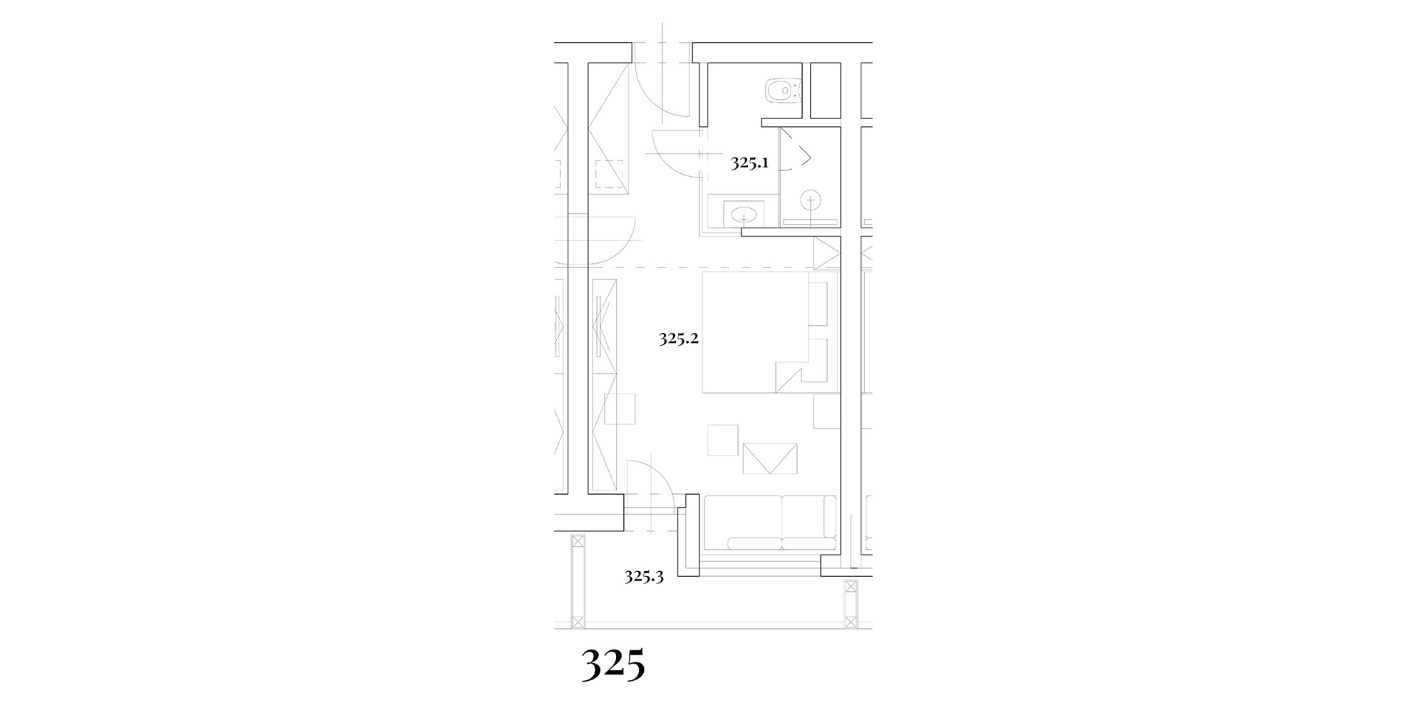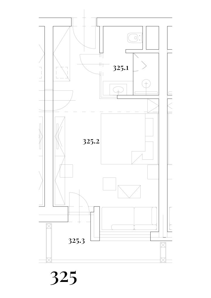 The standard suite offers a vestibule with storage space, an elegant bathroom, a cozy living room and a pleasant loggia connecting the interior with the surrounding nature. Every detail reflects Swiss quality and timeless design. The total area of the suite is 29.99 m².